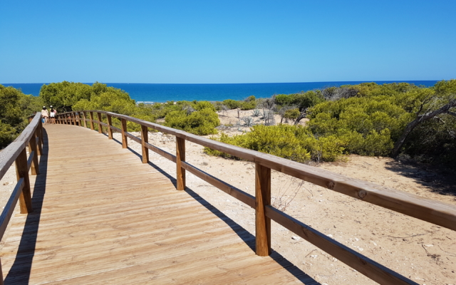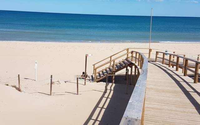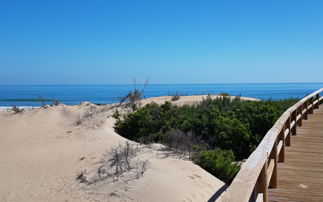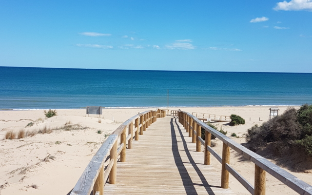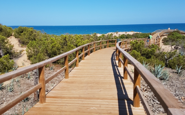 Prenez le pont bleu à pied afin de traverser la N332 et empruntez le ponton de bois qui vous amènera tout droit sur la plage.